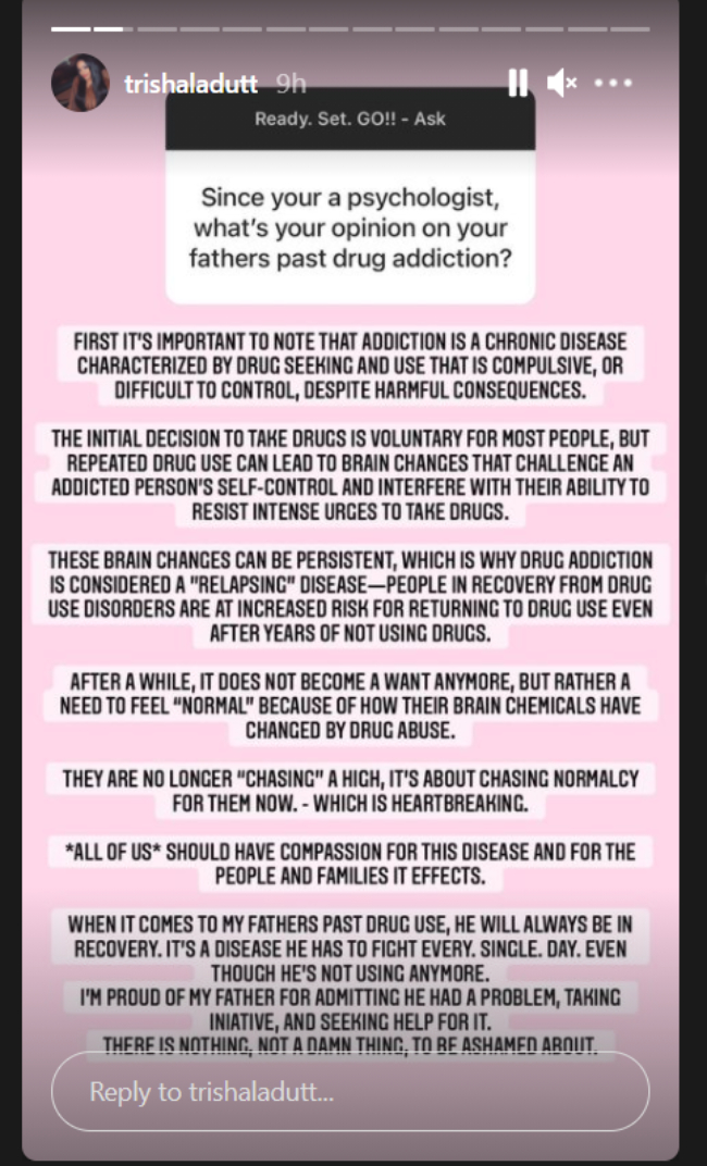 त्रिशाला दत्त से एक फैन ने सवाल किया था कि वो पेशे से एक साइकोलॉजिस्ट हैं। ऐसे में वह अपने पिता के ड्रग एडिक्शन के बारे में क्या सोचती हैं। संजय दत्त की बेटे ने इसके जवाब में एक लंबा नोट लिखा है।